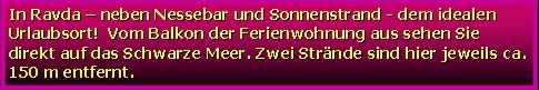 [Willkommen] [Hotel am Meer] [FeWo Allgemein] [FeWo Info + Preise] [FeWo Verkauf 1] [Ravda Infos] [Nähere Umgebung] [Unterhaltung] [Sehenswürdigkeiten] [Kultur] [Klima am Meer] [Kontakte] [Tipps] [Bulgarien Allgemein]