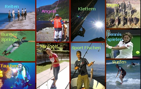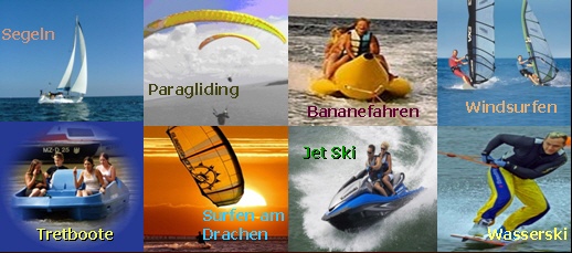 Schwimmen - Windsurfen - Surfen am Drachen - Jet Ski - Wasserski - Bananefahren - Tretbootfahren - Fallschirmspringen - Bangee Springen - Paragliding - Segeln - Yachting - Angeln - Sportfischen - Hochseeangeln - Tauchen - Reiten - Golf - Minigolf - Tennis - Kartfahren u.v.a.m.